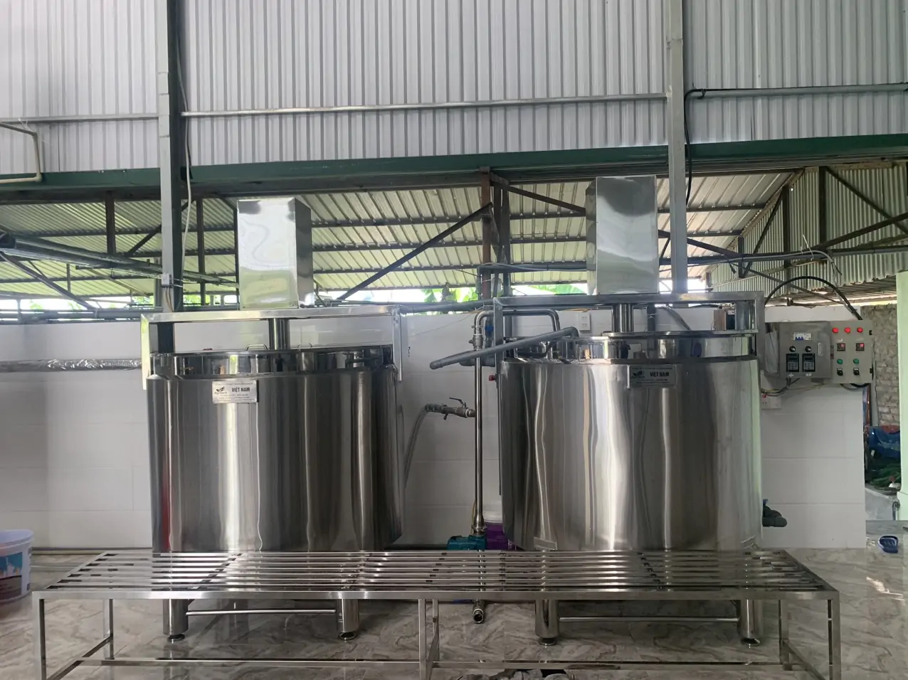 Trong dây chuyền sản xuất, nồi nấu inox đảm nhiệm nhiệm vụ gia nhiệt nguyên liệu, giúp quá trình chế biến diễn ra ổn định, đồng đều và kiểm soát tốt chất lượng sản phẩm.
